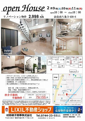 2/9(土)・10(日)・11(祝) 10:00~16:00に奈良市八条のリノベーション済物件のオープンハウスを行います(^^♪