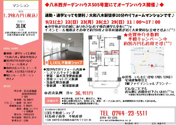 八木西ガーデンハウス505号室にてオープンハウス開催いたします!(^^)!